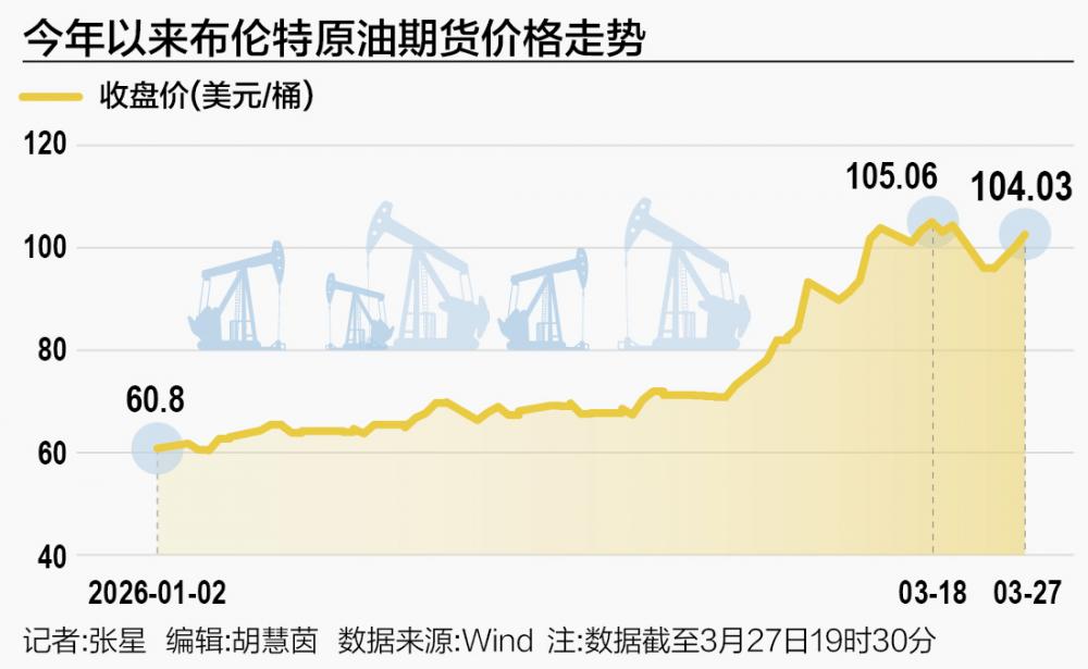 据央视新闻,因外界预期美国与伊朗谈判前景存不确定性,3月26日国际原油期价大幅上涨,布伦特原油期货报收100.1美元/桶,上涨2.92%。截至北京时间3月27日19时30分,纽约商品交易所5月交货的轻质原油期货价格报每桶97.04美元,涨幅为2.71%;伦敦布伦特原油期货价格报每桶104.03美元,涨幅为2.1%。
