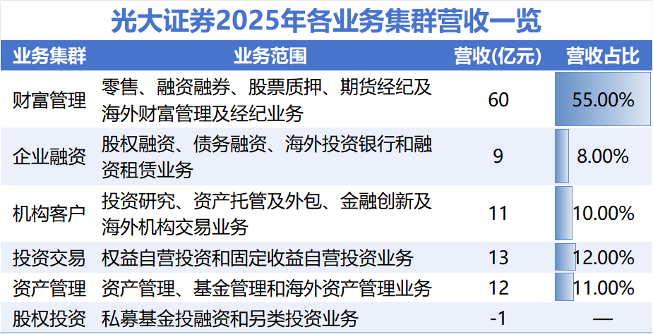 整体来看,作为在年报中被列为独立板块的业务集群,财富管理业务集群已成为光大证券业绩高增长的核心引擎。2025年,该业务集群实现收入60亿元,占比55%。