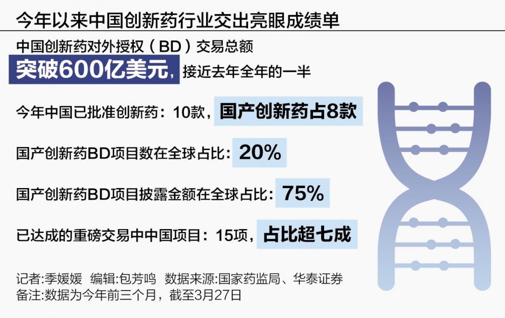 国家药监局最新发布的数据显示,今年前三个月,我国创新药对外授权(BD)交易总额突破600亿美元,已接近2025年全年1357亿美元总额的一半。截至3月27日,2026年已批准10款创新药,其中国产创新药占据8款。