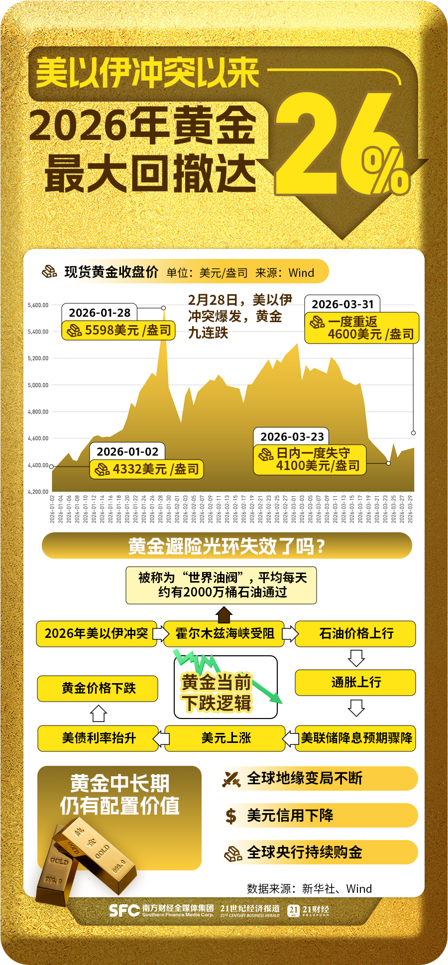 美以伊冲突背景下,市场正出现罕见一幕:国际油价暴涨60%,国际金价却上演过山车,从年内5598美元历史高位狂跌26%至4099美元,金价九连跌之后又实现三连涨,截至3月31日,黄金暴力反弹至4600美元。美元指数也强势突破100关口,三者打破传统负相关魔咒,同步上涨。