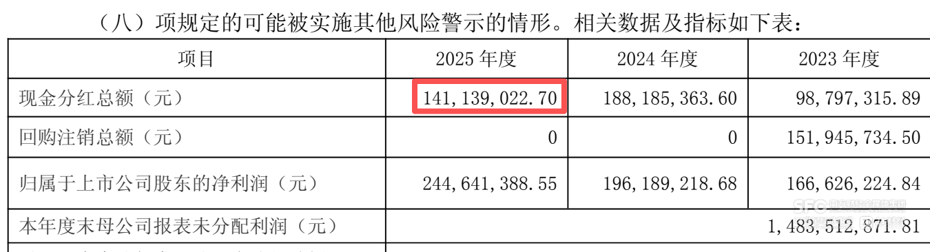 年度利润分配预案显示,会稽山2025年度拟每10股分红3元,现金分红总额从前一年同期的1.88亿元减少至1.41亿元,分红率从前一年的95%大幅回落至57%。