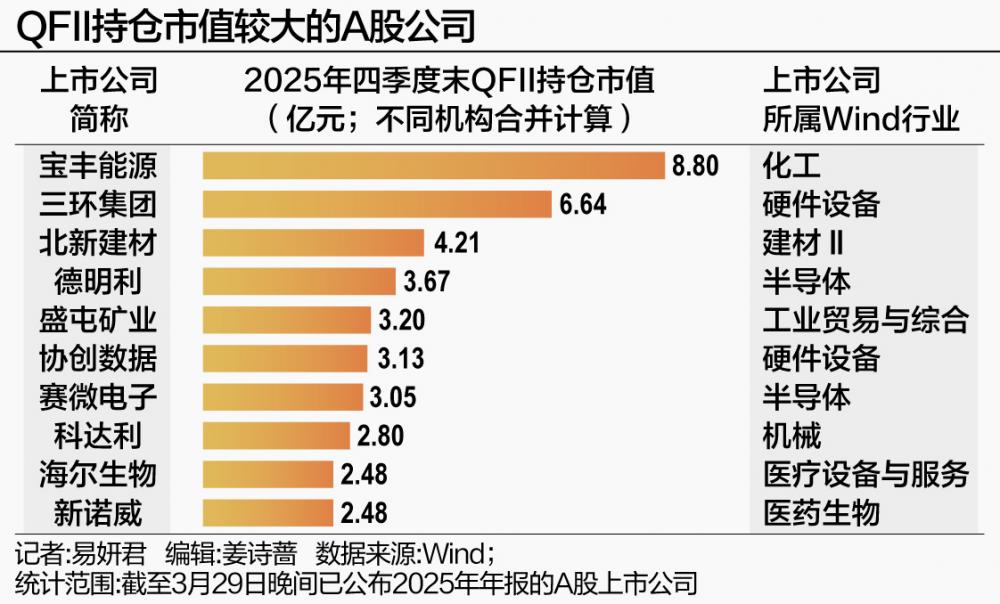 在目前已公布2025年年报的公司中,QFII持仓市值达到1亿元以上(不同机构合并计算)的个股超过30只。