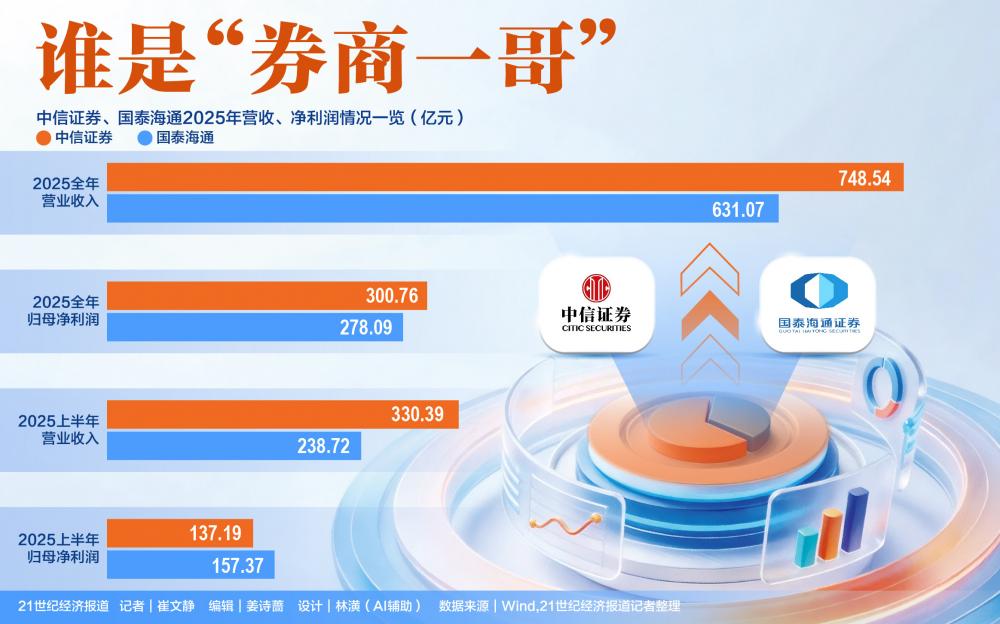 2025年半年报是国泰君安与海通证券合并为国泰海通后的首份半年报,2025年年报则是二者合并后的首份年报。在2025年半年报时,中信证券的归母净利润曾被国泰海通超越,彼时,中信证券半年归母净利润为137.19亿元,比国泰海通少了20.18亿元。