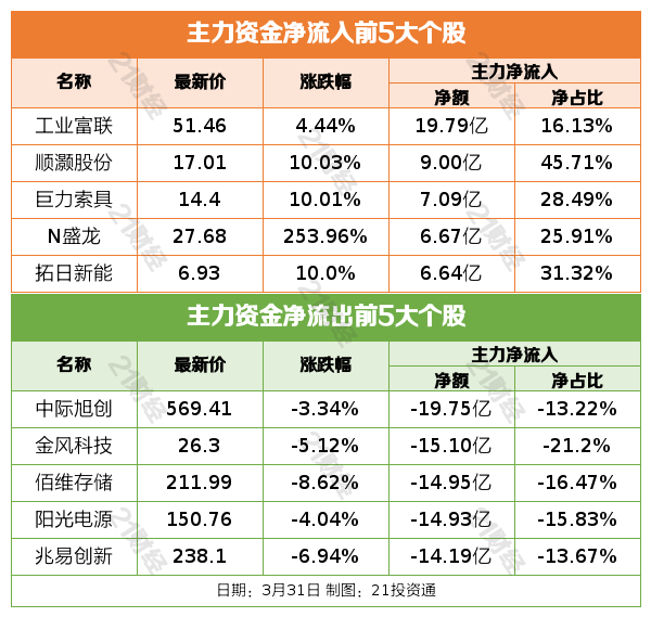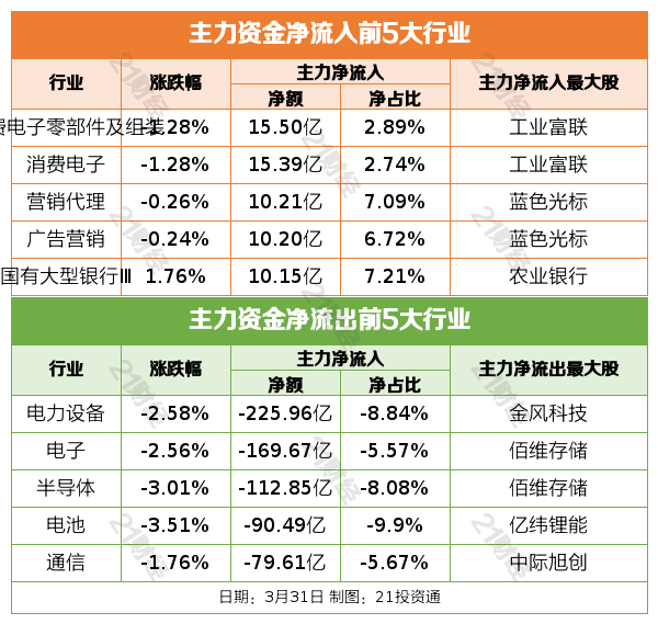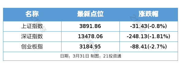 3月31日,上证指数跌0.8%报3891.86点,深证成指跌1.81%报13478.06点,创业板指跌2.7%报3184.95点,北证50跌0.99%报1248.29点。全市场成交额19975亿元,较上日成交额放量699亿元。全市场超4300只个股下跌。