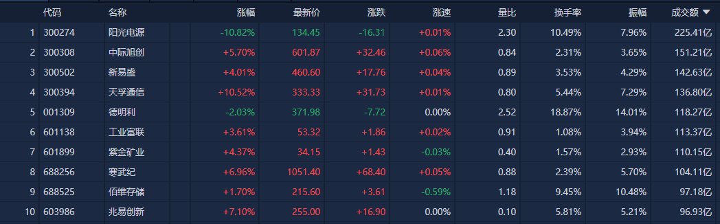 个股方面,阳光电源成交额超225亿居首,中际旭创、新易盛、天孚通信、德明利等个股成交额均超百亿。