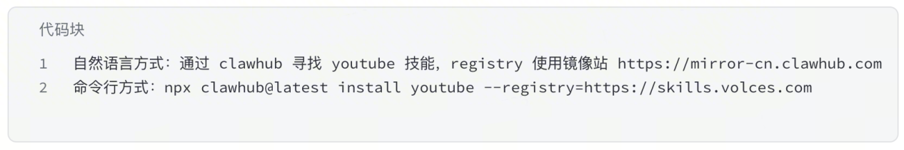 以自然语言接入“ClawHub镜像站”使用“YouTube”技能为例,输入:“通过 clawhub 寻找 youtube 技能,registry 使用镜像站https://mirror-cn.clawhub.com”,即可快速接入“ClawHub镜像站”、下载并使用相应的skill。其他任务只需要按照上述提示词模板,替换相应的skill名称。