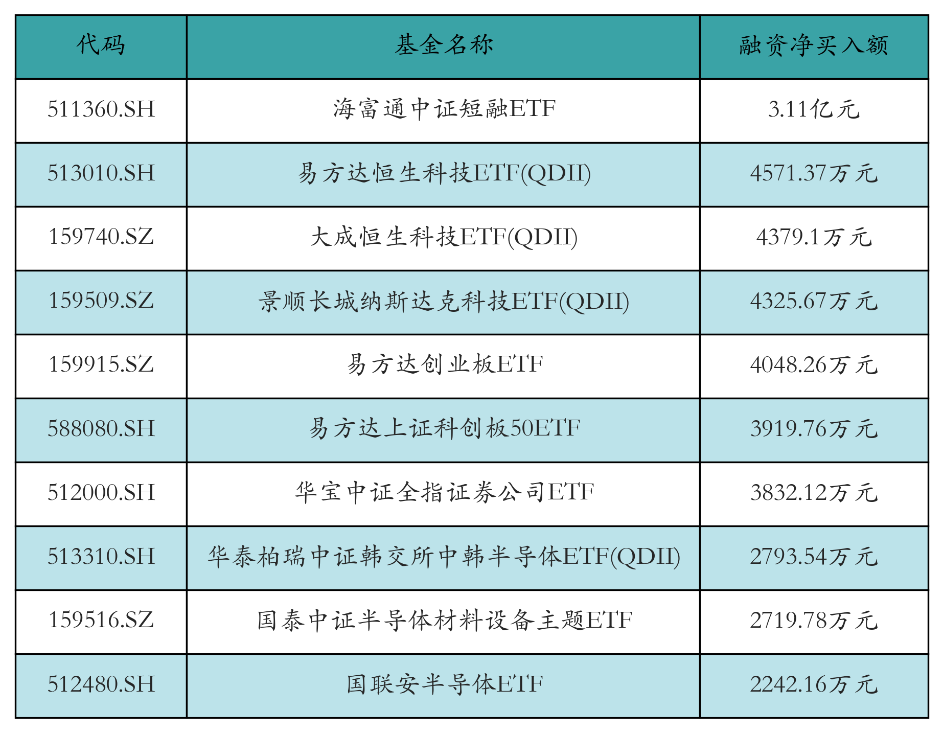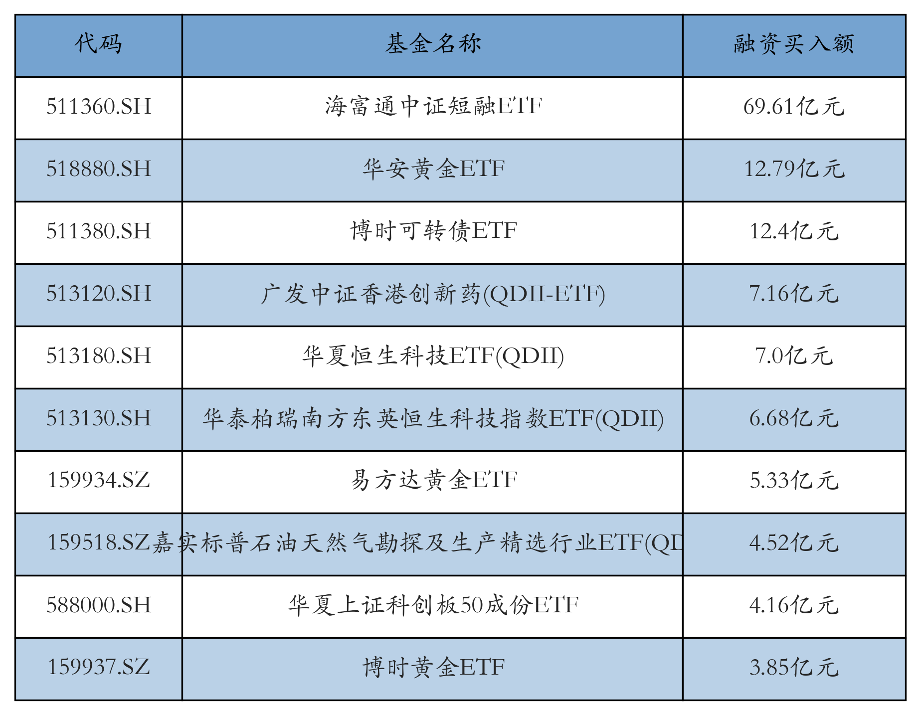 4月2日ETF融资买入额前三位分别为:海富通中证短融ETF(69.61亿元)、华安黄金ETF(12.79亿元)和博时可转债ETF(12.4亿元),前10具体见下表:
