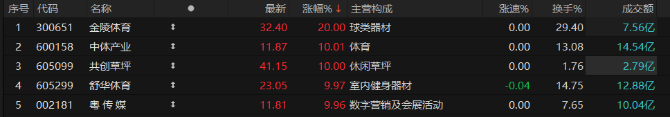 4月7日,体育产业板块午后走强,金陵体育“20cm”涨停,舒华体育、中体产业、共创草坪涨停。