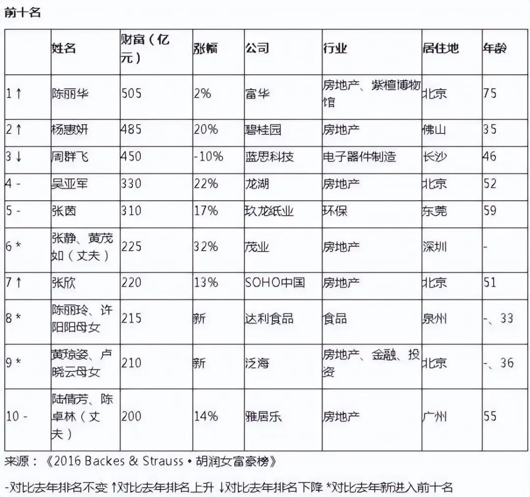 陈丽华是早年福布斯中国富豪榜上最知名、长期唯一稳定上榜的中国女富豪。2001年福布斯中国内地100富豪榜上,陈丽华以55亿元的财富排名第6位,成为中国内地女首富。2012福布斯中国富豪榜以176.4亿元的财富排名第17位。2014福布斯中国400富豪榜上,陈丽华以373亿元的身家成为全球白手起家女富豪榜第一名。2018年的胡润女企业家榜,陈丽华以505亿元位居第三。