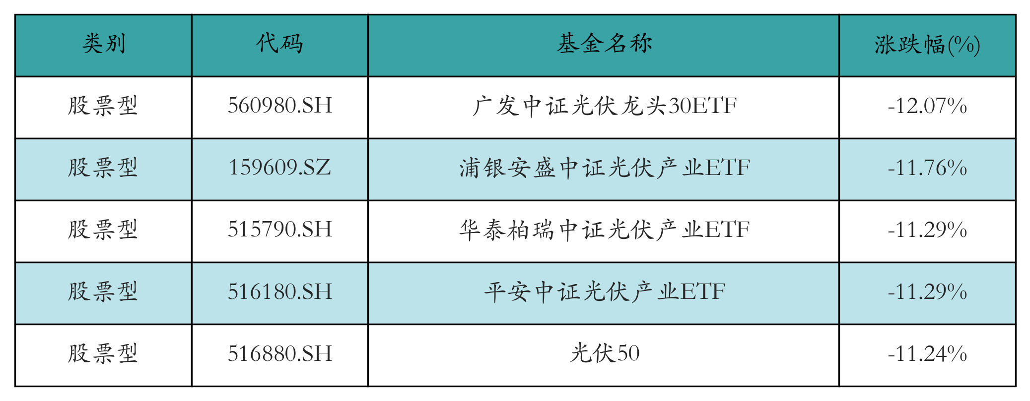 上周股票型ETF跌幅最大的5只ETF及其收益率分别为:广发中证光伏龙头30ETF(-12.07%)、浦银安盛中证光伏产业ETF(-11.76%)、华泰柏瑞中证光伏产业ETF(-11.29%)、平安中证光伏产业ETF(-11.29%)、光伏50(-11.24%)。详情见下表: