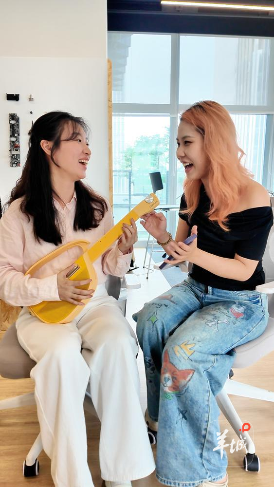 记者刘泳希与Liberlive产品经理李嘉欣一起弹琴。羊城晚报记者 温泽广 摄