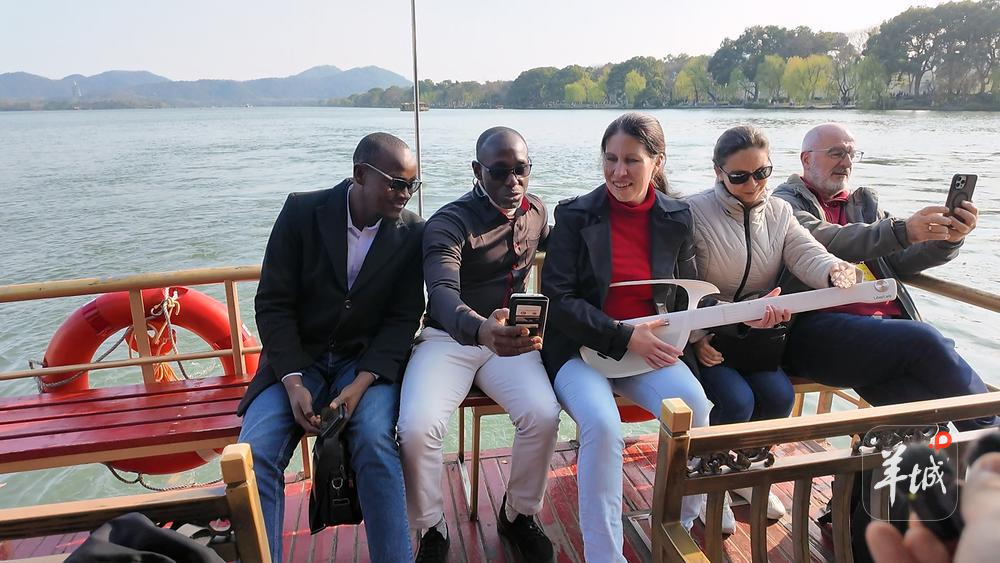 赫列娜在西湖上与同行的外媒记者弹唱 受访者提供