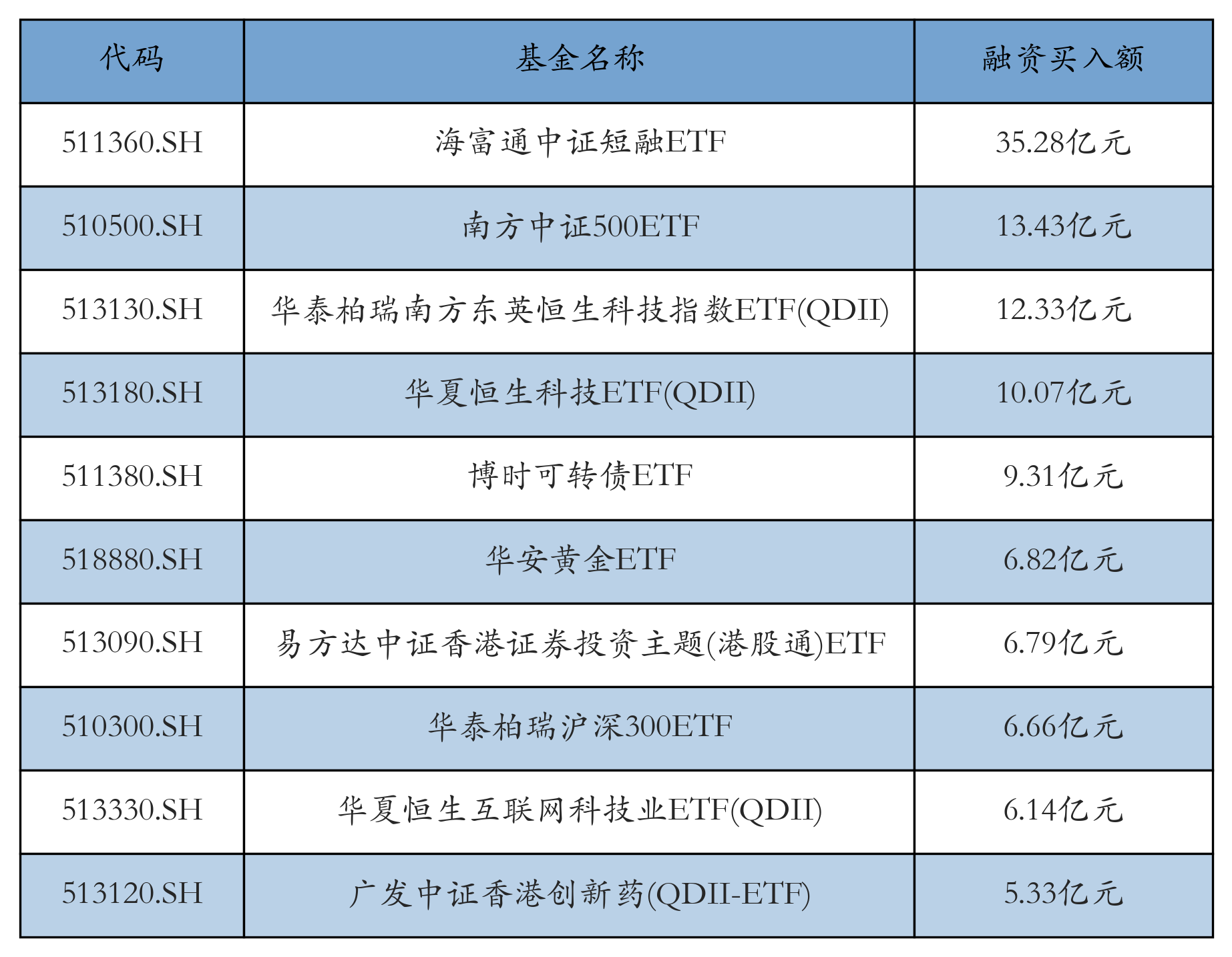 4月8日ETF融资买入额前三位分别为:海富通中证短融ETF(35.28亿元)、南方中证500ETF(13.43亿元)和华泰柏瑞南方东英恒生科技指数ETF(QDII)(12.33亿元),前10具体见下表:
