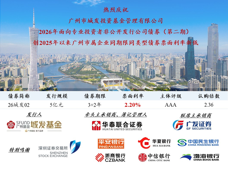 日前,广州城投集团旗下金融平台广州市城发投资基金管理有限公司(以下简称“城发基金”),完成了2026年面向专业投资者非公开发行公司债券(第二期)的定价与发行工作。