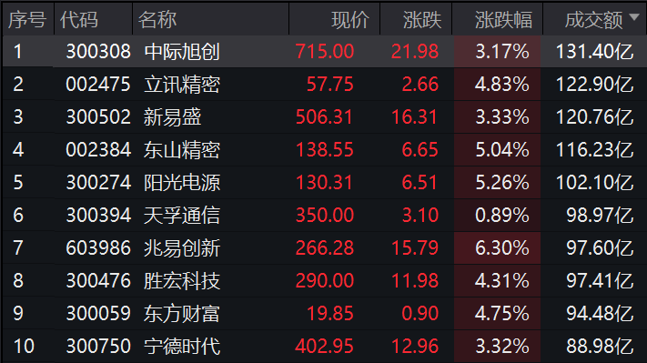 个股方面,中际旭创半日成交额超131亿元居首,立讯精密、新易盛、东山精密成交额靠前。