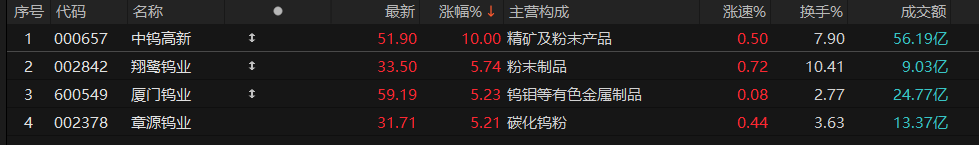 4月16日,钨板块盘中震荡反弹,中钨高新涨停,章源钨业、翔鹭钨业、厦门钨业跟涨。
