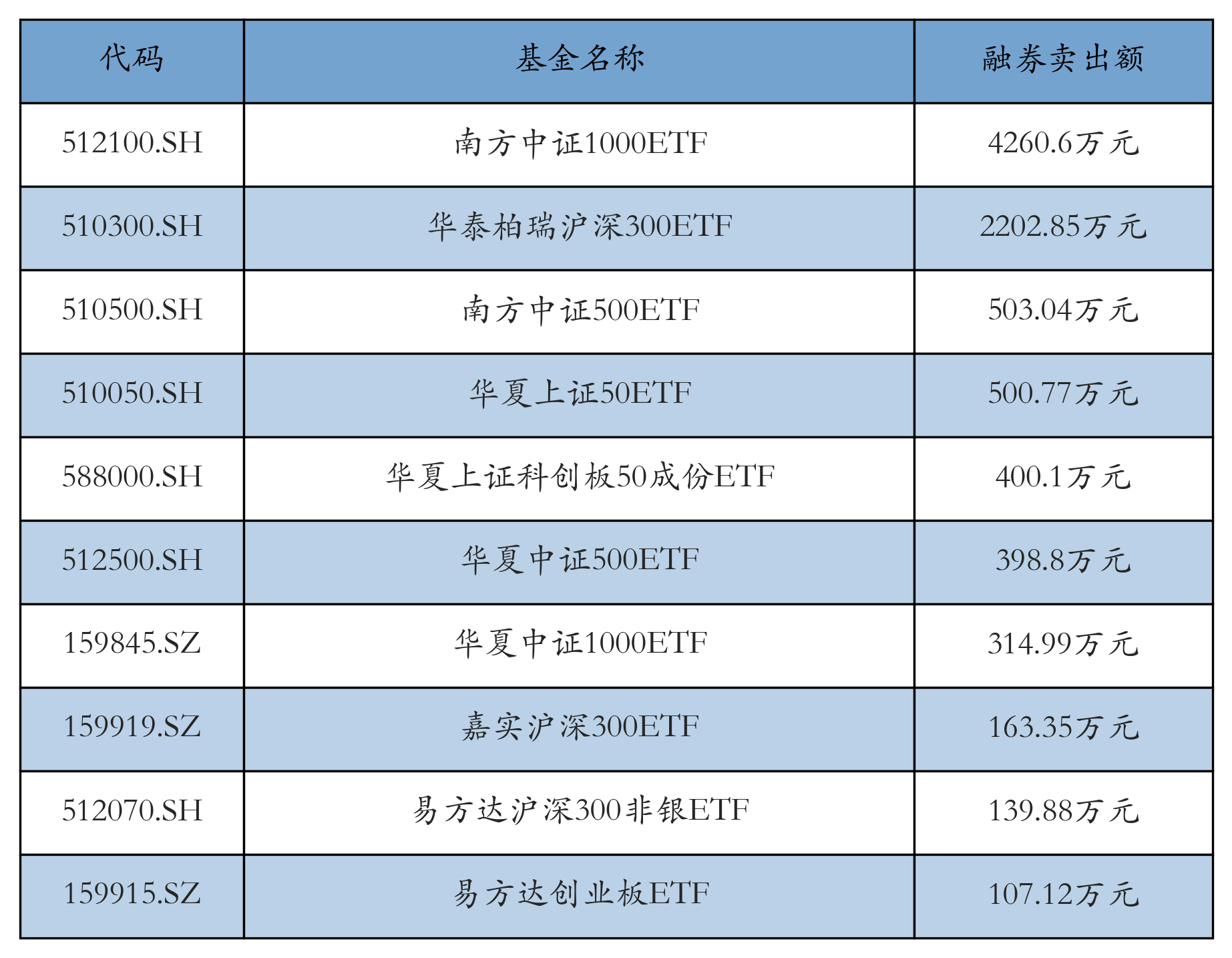 4月15日ETF融券卖出额前三位分别为:南方中证1000ETF(4260.6万元)、华泰柏瑞沪深300ETF(2202.85万元)和南方中证500ETF(503.04万元),前10具体见下表: