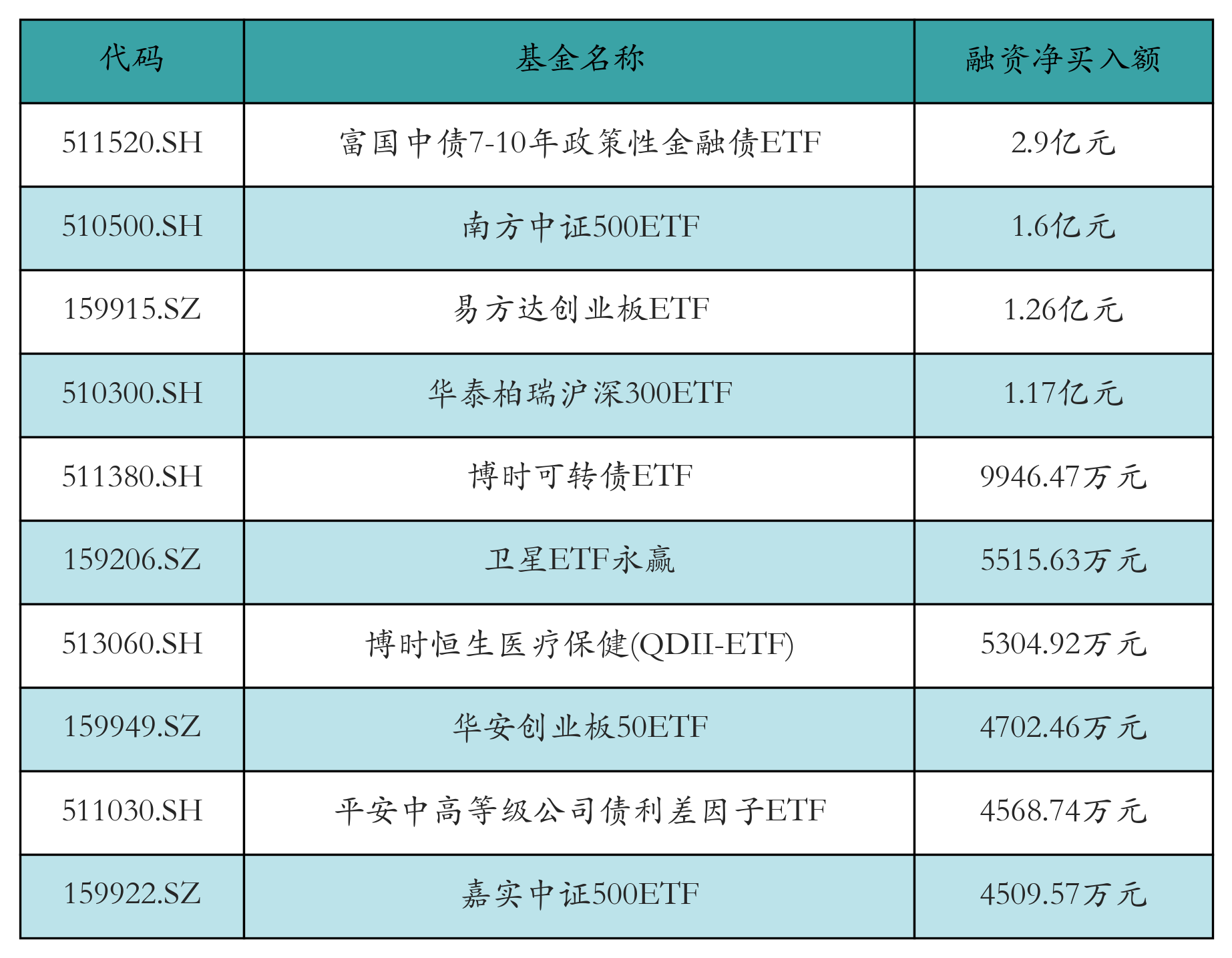 4月15日ETF融资买入额前三位分别为:海富通中证短融ETF(57.13亿元)、博时可转债ETF(9.68亿元)和广发中证香港创新药(QDII-ETF)(8.02亿元),前10具体见下表: