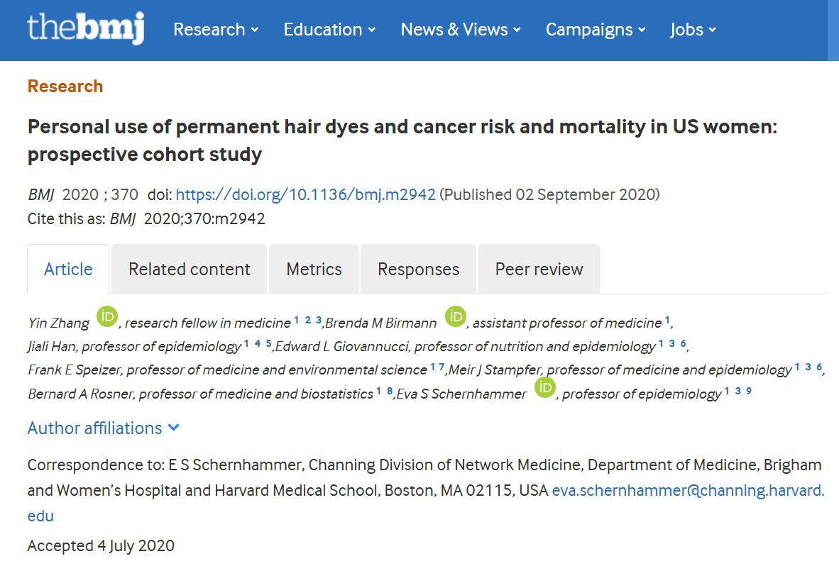 此外,染发与癌症风险也存在关联。2020年,发表在《英国医学杂志》上一项大型前瞻性队列研究发现,使用过永久染发剂的人群的基底细胞癌风险略有升高。累积使用剂量与雌激素受体阴性乳腺癌、孕激素受体阴性乳腺癌、激素受体阴性乳腺癌及卵巢癌的发病风险呈正相关。