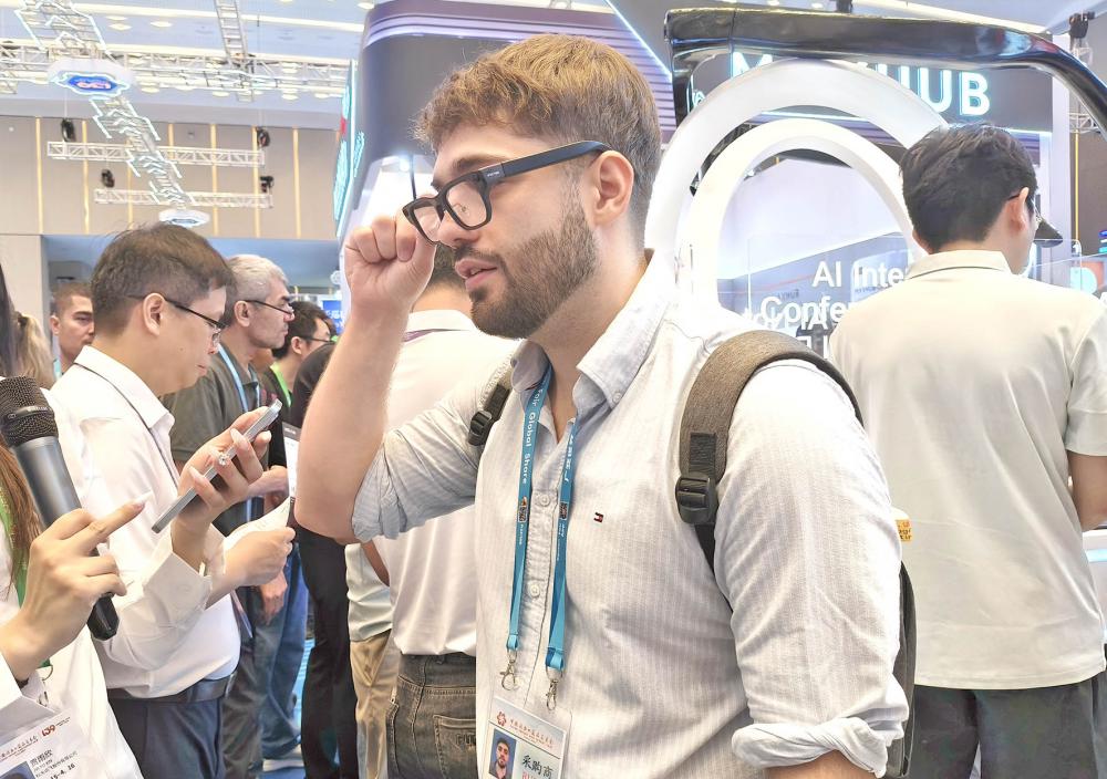 Ramtin端着一杯由机器人制作的咖啡,拉花图案正是他的一张照片。他对机器人和太阳能光伏板很感兴趣,喝完咖啡便再次扎入人潮。来自阿根廷的Tomas对试戴的AI眼镜赞不绝口——耳边是中文解说,眼前镜片上实时显示出翻译后的文字。