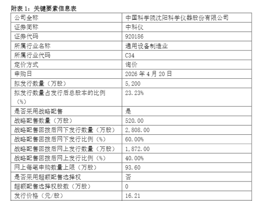 4月20日,中国科学院沈阳科学仪器股份有限公司(下称“中科仪”,920186)正式启动网下、网上申购。