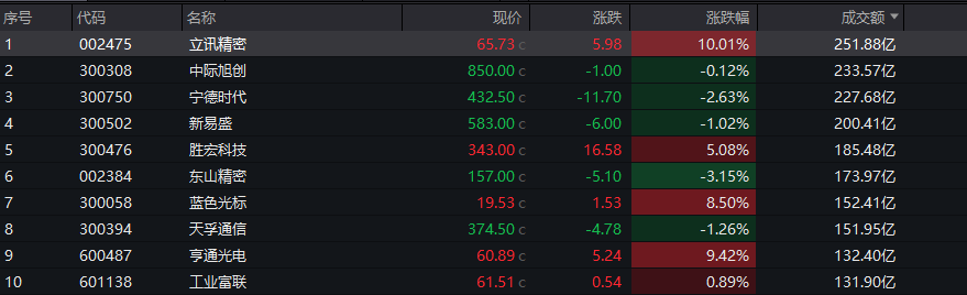个股方面,立讯精密成交额近252亿元居沪深两市第一,中际旭创、宁德时代等个股成交额紧跟其后。