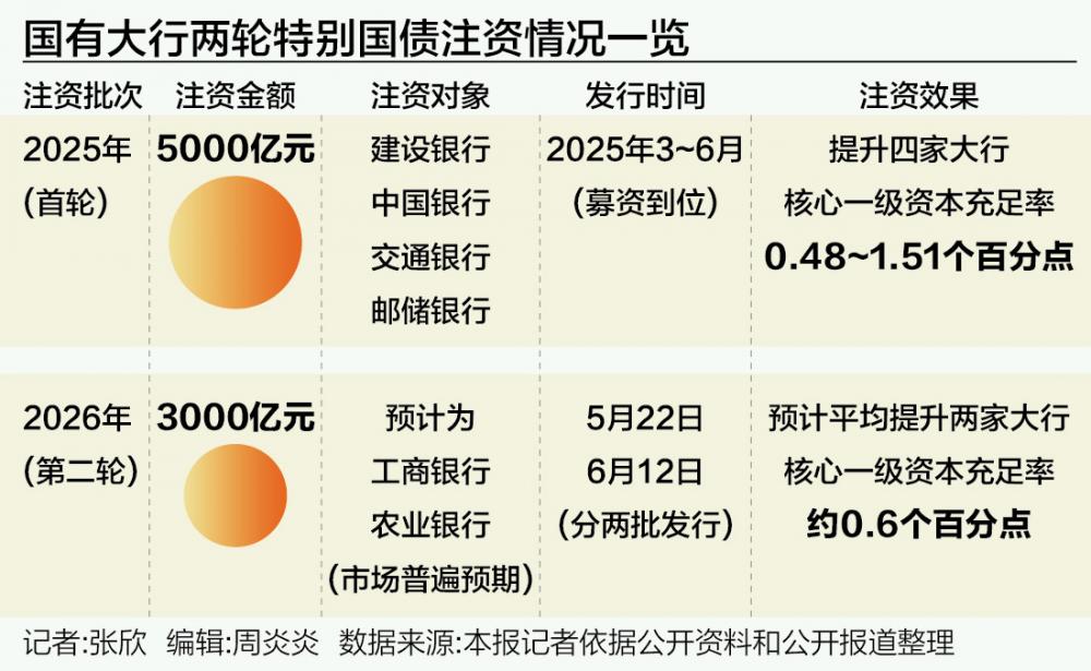 2025年,我国通过特别国债完成首轮注资,财政部牵头对建行、中行、交行、邮储银行四家银行实施定向增发,合计注资5000亿元;2026年,3000亿元特别国债即将启动,支持国有大行补充资本。两轮注资规模合计达8000亿元,形成覆盖国有大行的系统性资本支持安排。