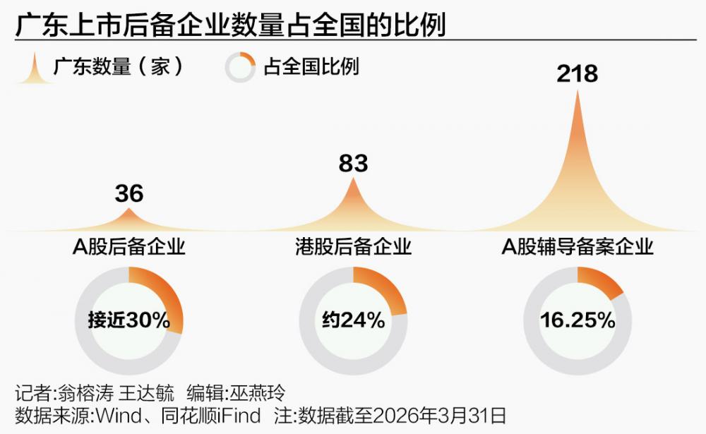 数据显示,截至2026年3月底,广东境内外IPO后备军团总量达119家,较2025年3月底的32家大幅增长280%。其中,A股后备军团36家,同比增长112%,占全国比例接近30%;港股后备军团83家,同比大涨超450%,占全国比例约为24%;A股辅导备案企业218家,占全国比例为16.25%,上述三项占比均位居全国第一。