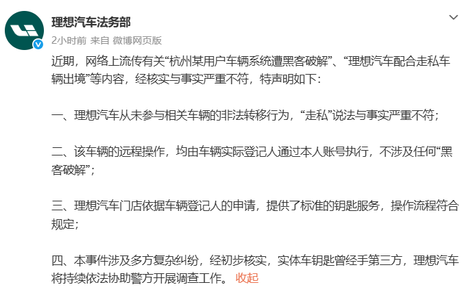 近期,网络上流传有关“杭州某用户车辆系统遭黑客破解”、“理想汽车配合走私车辆出境”等内容,经核实与事实严重不符,特声明如下: