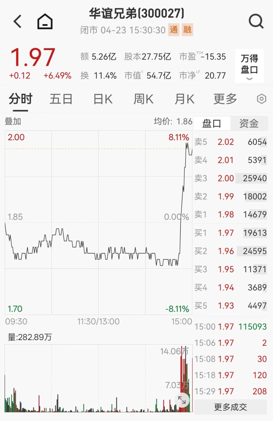 截至4月23日收盘,华谊兄弟的股价为1.97元/股,市值为54.7亿元。