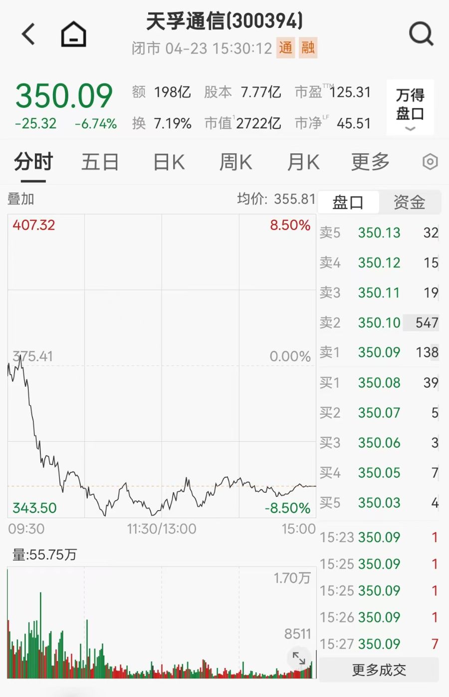 截至4月23日收盘,天孚通信报350.09元/股,总市值2722亿元,自去年同期以来,股价涨幅已超6倍。