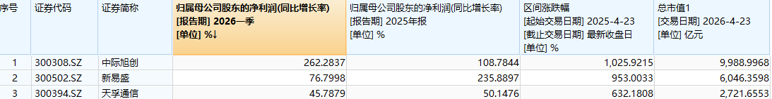 截至目前,中际旭创市值9989亿元,新易盛市值6046亿元,天孚通信市值2722亿元。