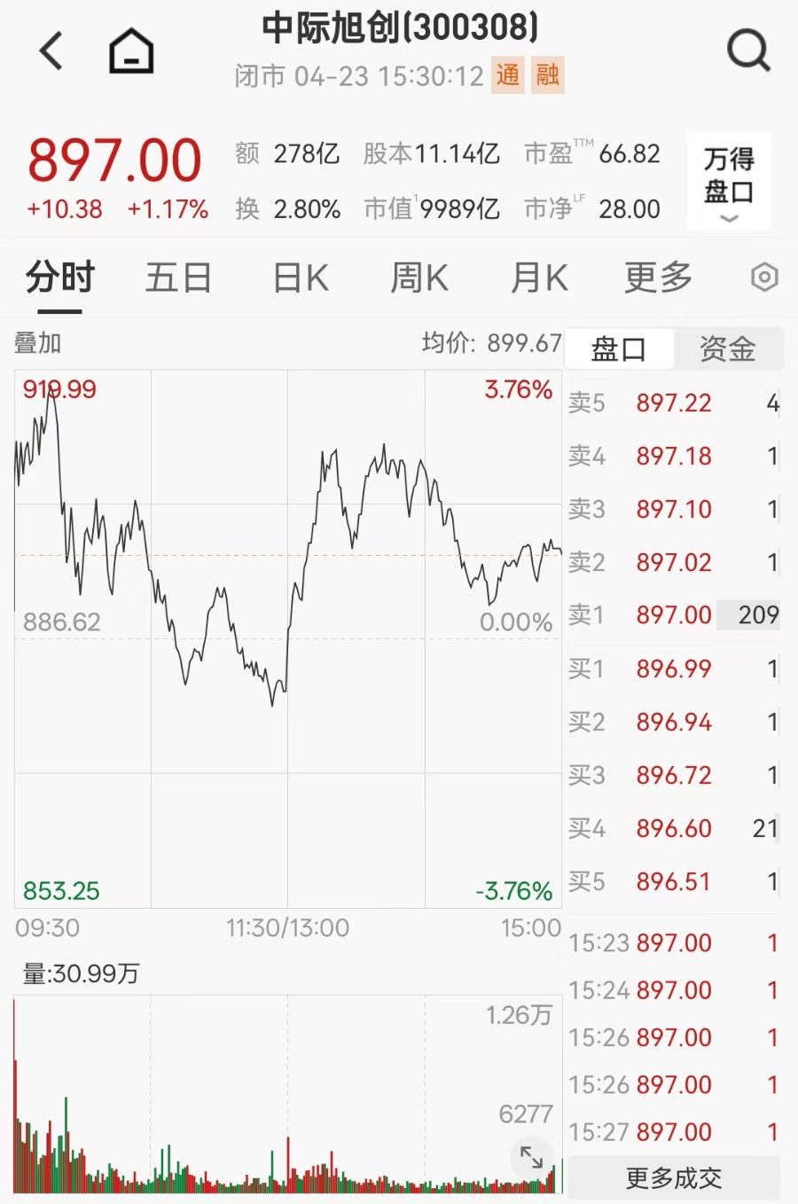 4月23日盘中,中际旭创股价一度涨超3%至919.99元,总市值冲破万亿元大关,自去年同期以来,涨幅已超10倍。截至当日收盘,中际旭创报897元/股,总市值为9989亿元。