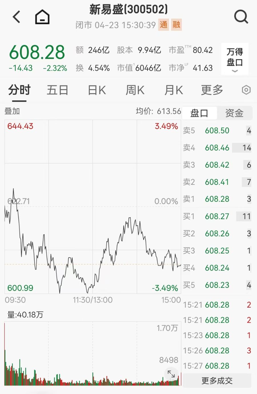 截至4月23日收盘,新易盛股价报608.28元/股,总市值为6046亿元,自去年同期以来,股价涨幅已超9倍。