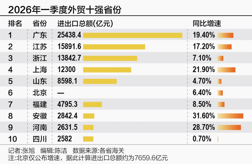 一季度,广东、江苏、浙江、上海、山东合计贡献全国超过六成的进出口增量。