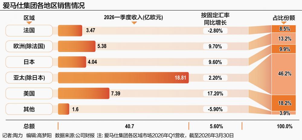 从业务板块看,核心皮具与马具部门按固定汇率增长9.4%至18.5亿欧元,仍是增长引擎;成衣与配饰部门仅增长0.4%,腕表继续承压下滑3.7%。区域市场中,包含中东在内的其他地区销售额同比下滑5.9%,仅为1.6亿欧元,中东局势对集团一季度整体增长造成了约1.5个百分点的拖累。其中,阿拉伯联合酋长国,以及科威特、卡塔尔和巴林所受影响尤为明显。