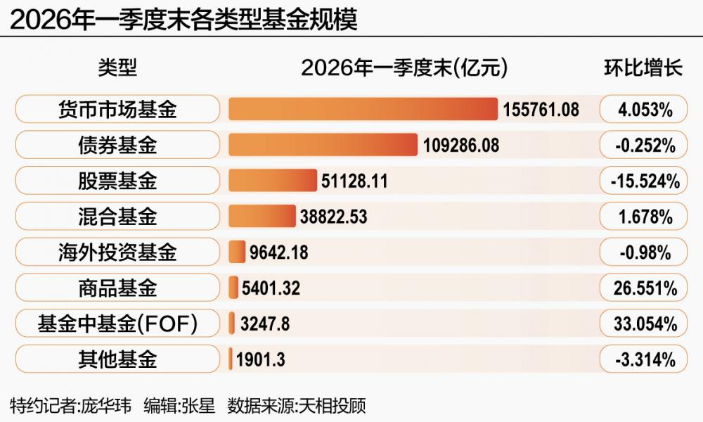 国泰海通证券的统计印证了这一趋势:一季度,混合型基金、商品型基金和FOF等规模均实现环比增长,而股票型基金、债券型基金、QDII债券型基金等规模则有所缩减。