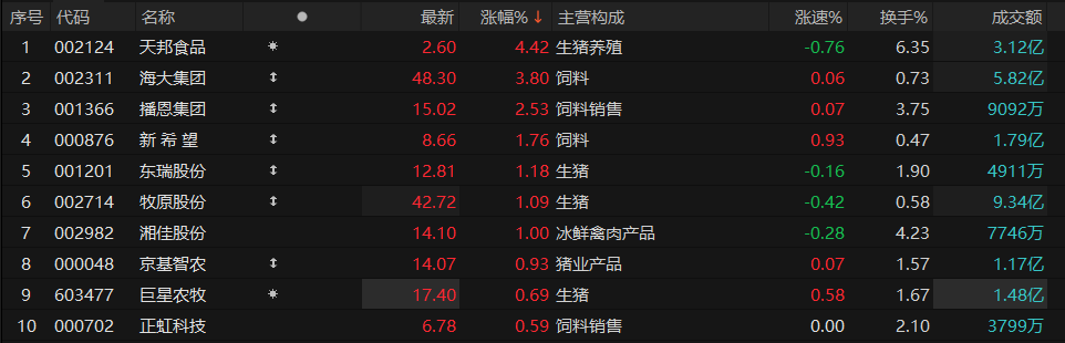 午后,猪肉概念异动拉升。截至发稿,天邦食品涨超4%,海大集团、播恩集团等跟涨。