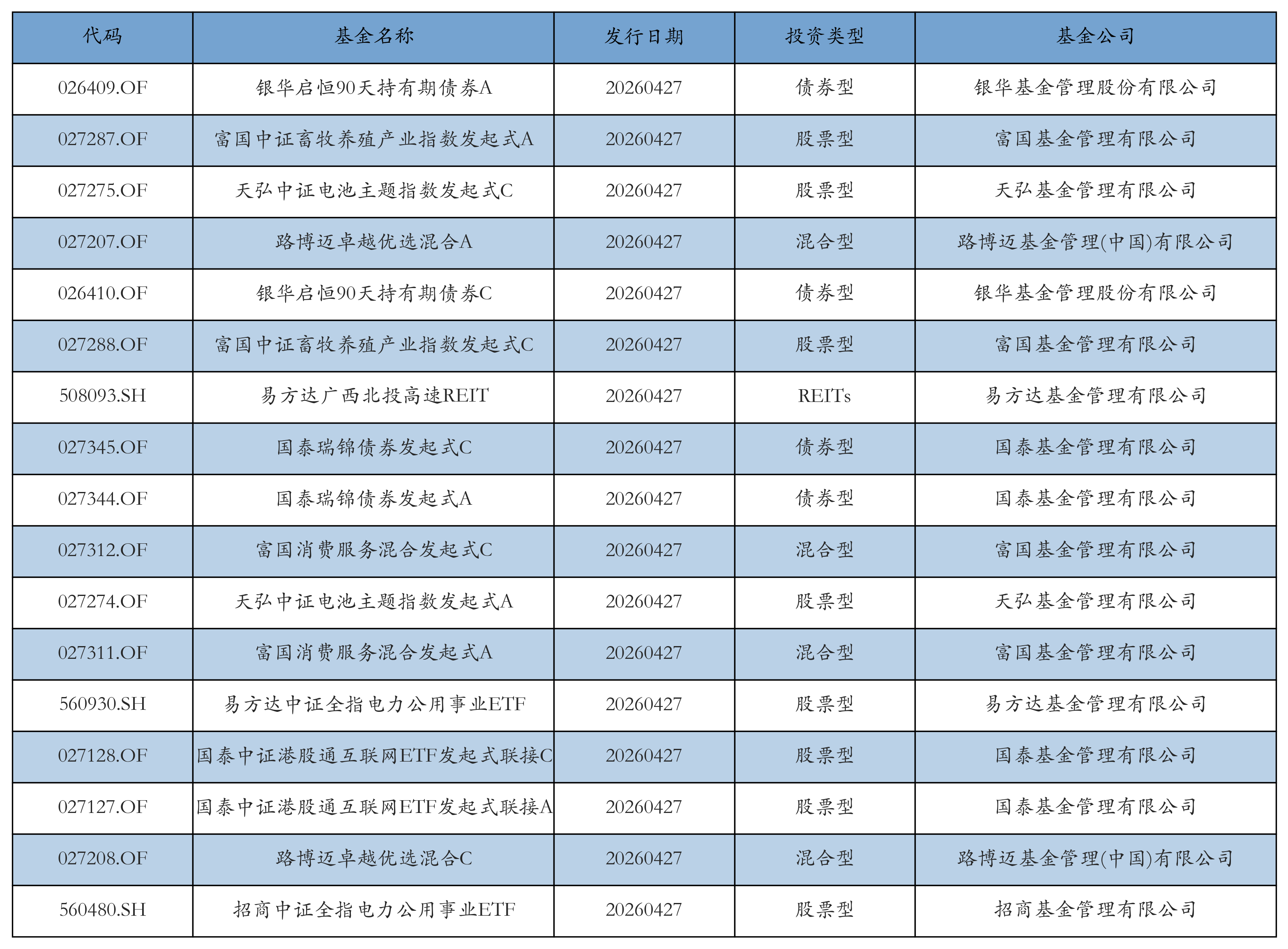 昨日有17只新基金发行,分别为:银华启恒90天持有期债券A、富国中证畜牧养殖产业指数发起式A、天弘中证电池主题指数发起式C、路博迈卓越优选混合A、银华启恒90天持有期债券C、富国中证畜牧养殖产业指数发起式C、易方达广西北投高速REIT、国泰瑞锦债券发起式C、国泰瑞锦债券发起式A、富国消费服务混合发起式C、天弘中证电池主题指数发起式A、富国消费服务混合发起式A、易方达中证全指电力公用事业ETF、国泰中证港股通互联网ETF发起式联接C、国泰中证港股通互联网ETF发起式联接A、路博迈卓越优选混合C、招商中证全指电力公用事业ETF,详情见下表: