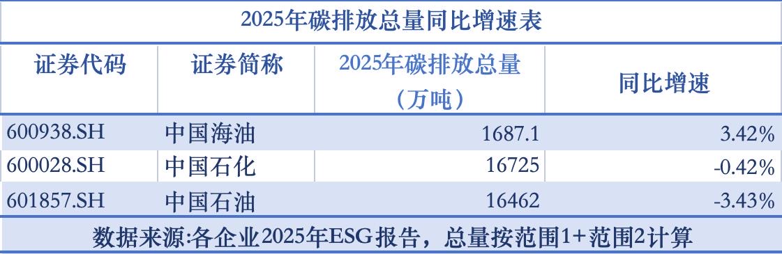 中国石化、中国石油碳排放同比均下降。中国石化在ESG报告中表示,2025年温室气体排放总量为167.25百万吨二氧化碳当量。与2024年相比,变化的主要原因是公司持续强化碳排放管控,积极开展甲烷监测和控排管理,碳排放量同比下降0.42%。此外,公司已组织研究制定范围3碳排放核算方法,正在对部分所属企业开展方法试算验证工作,下一步将对公司范围3碳排放数据进行计算。