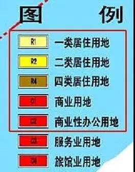 规划图一般都自带图例,里面标注的不同颜色就代表了不同性质的用地类型,而我们只需要重点关注几个颜色: