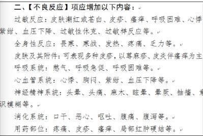 中药注射液不良反应有着各种影响,可以涉及呼吸系统、心血管系统、消化系统等,包括口干、皮疹、心悸等,甚至引起死亡,如2006年的鱼腥草注射液事件,当时其曾致北京、武汉两地6人死亡;2008年,刺五加注射液导致严重不良反应,导致3名患者死亡;茵栀黄注射液导致4名新生儿发生不良反应,其中1名死亡;2009年,双黄连注射液发生不良事件,并出现死亡病例报告;香丹注射液导致13名患者发生不良反应;2011年,喜炎平注射液导致49名患者发生严重不良反应……