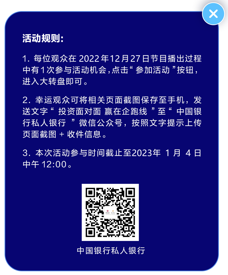 幸运观众可将相关页面截图保存至手机,发送文字“投资面对面 赢在企跑线”至“中国银行私人银行”微信公众号,按照文字提示上传页面截图+收件信息。