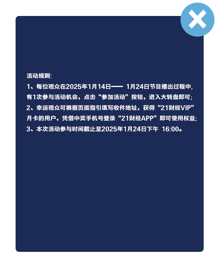 幸运观众可根据页面指引填写收件地址,获得“21财经VIP’月卡的用户,凭借中奖手机号登录“21财经APP”即可使用权益。