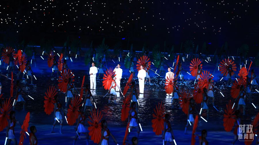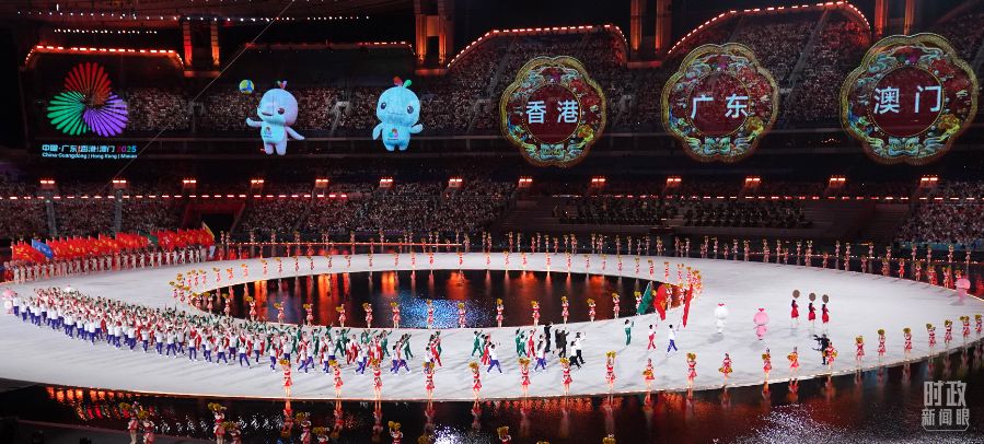 开幕式巧妙融入香港维多利亚港、澳门大三巴、广州塔等城市地标元素,实现粤港澳三地同步升国旗仪式。