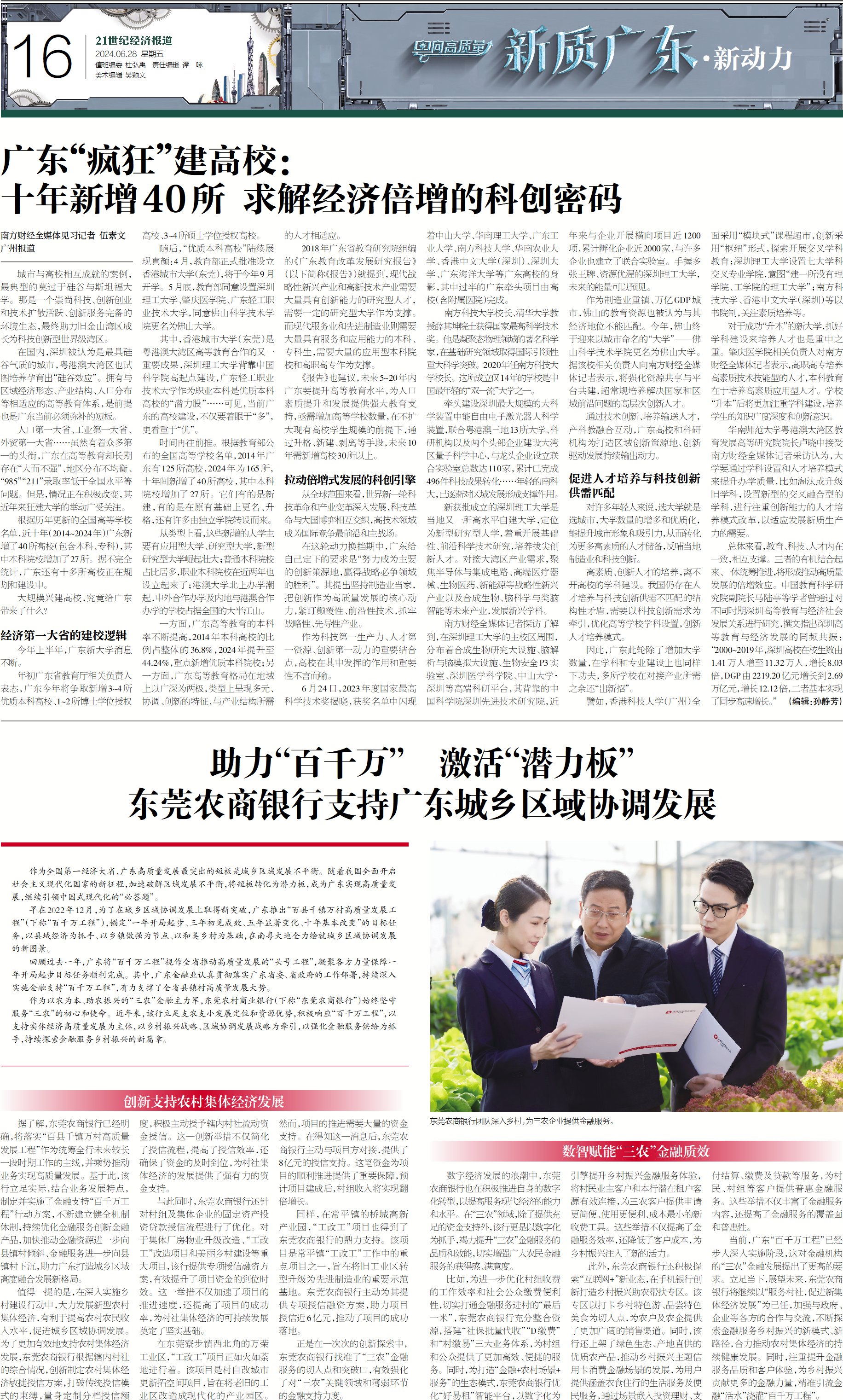 创新需要源源不断的高精尖人才供应。为增强科创新动力,广东聚焦补创新能力短板,“疯狂”建设各类新型大学,十年里新增了40所高校。通过技术创新、培养人才、产教融合互动,广东高校和科研机构为打造区域创新策源地、创新驱动发展持续输出动力。