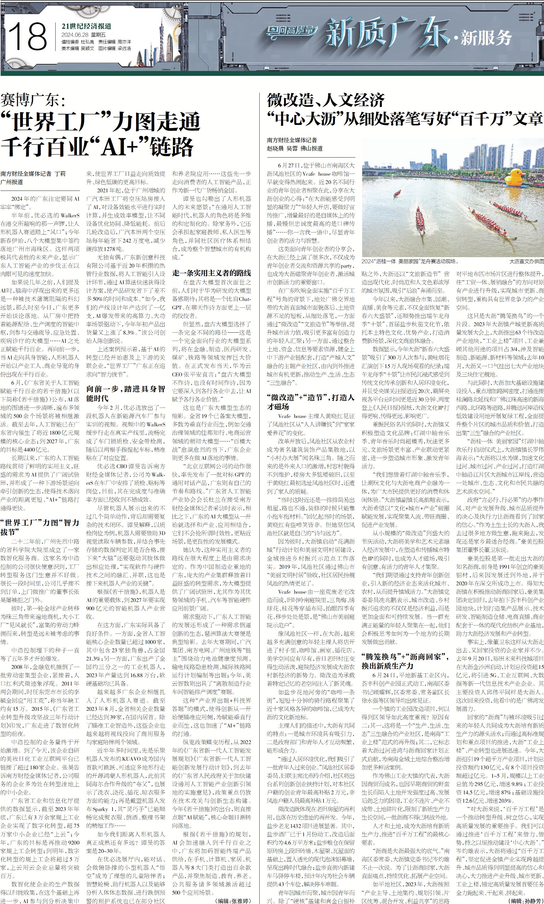 高质量发展本质上是创新驱动发展。“世界工厂”创新的脚步从未停歇过,近年来聚力人工智能、低空经济、新能源等未来产业,不断向“智造”迈进,新动能持续迸发。例如,面对作为全新产业课题的低空经济,广东前瞻布局,在政策支持、技术创新、场景应用方面引领全国。再比如,紧跟全球人工智能步伐,广东已经发力打造“赛博广东”,到2027年冲刺人工智能核心产业规模超4400亿元目标。