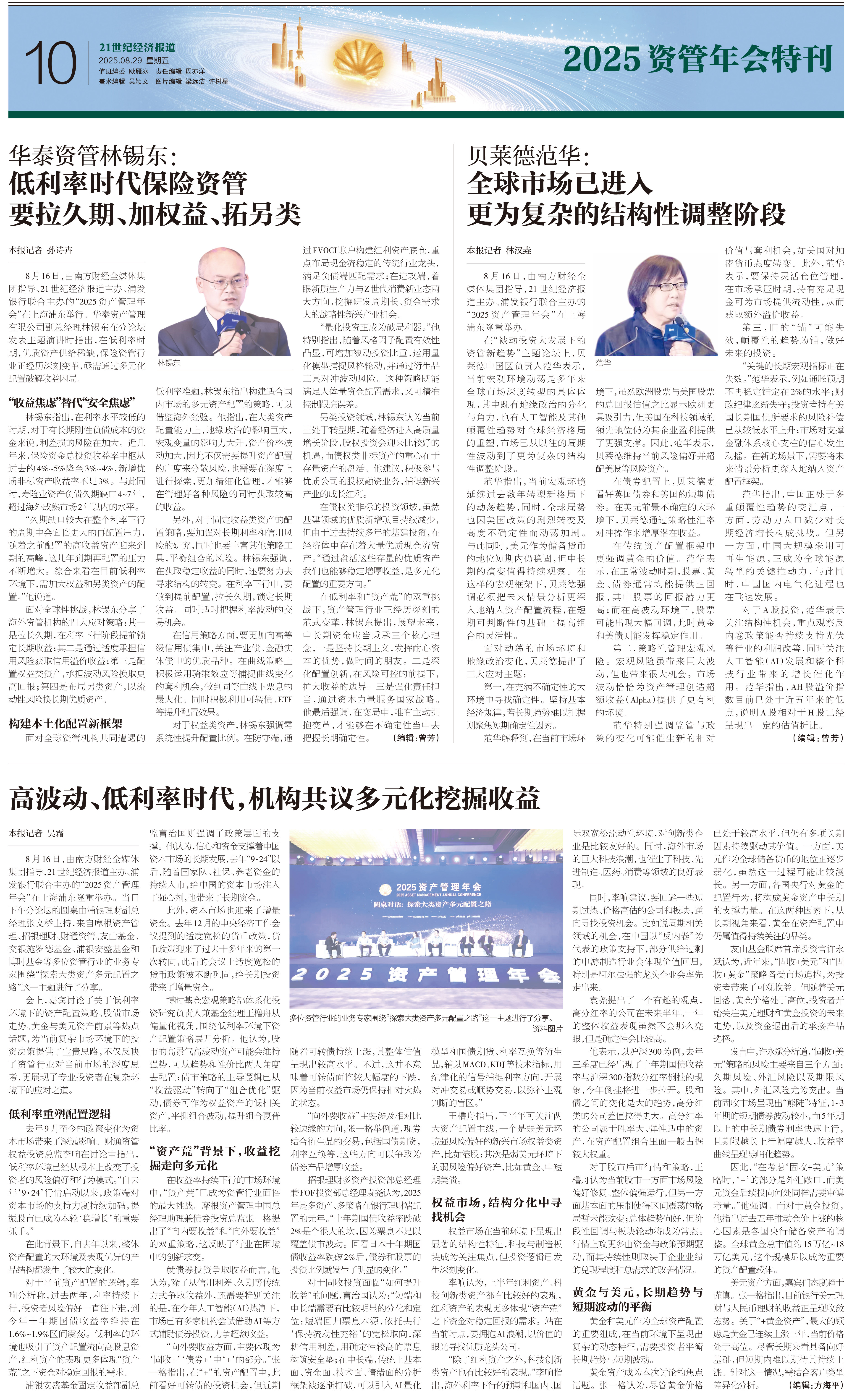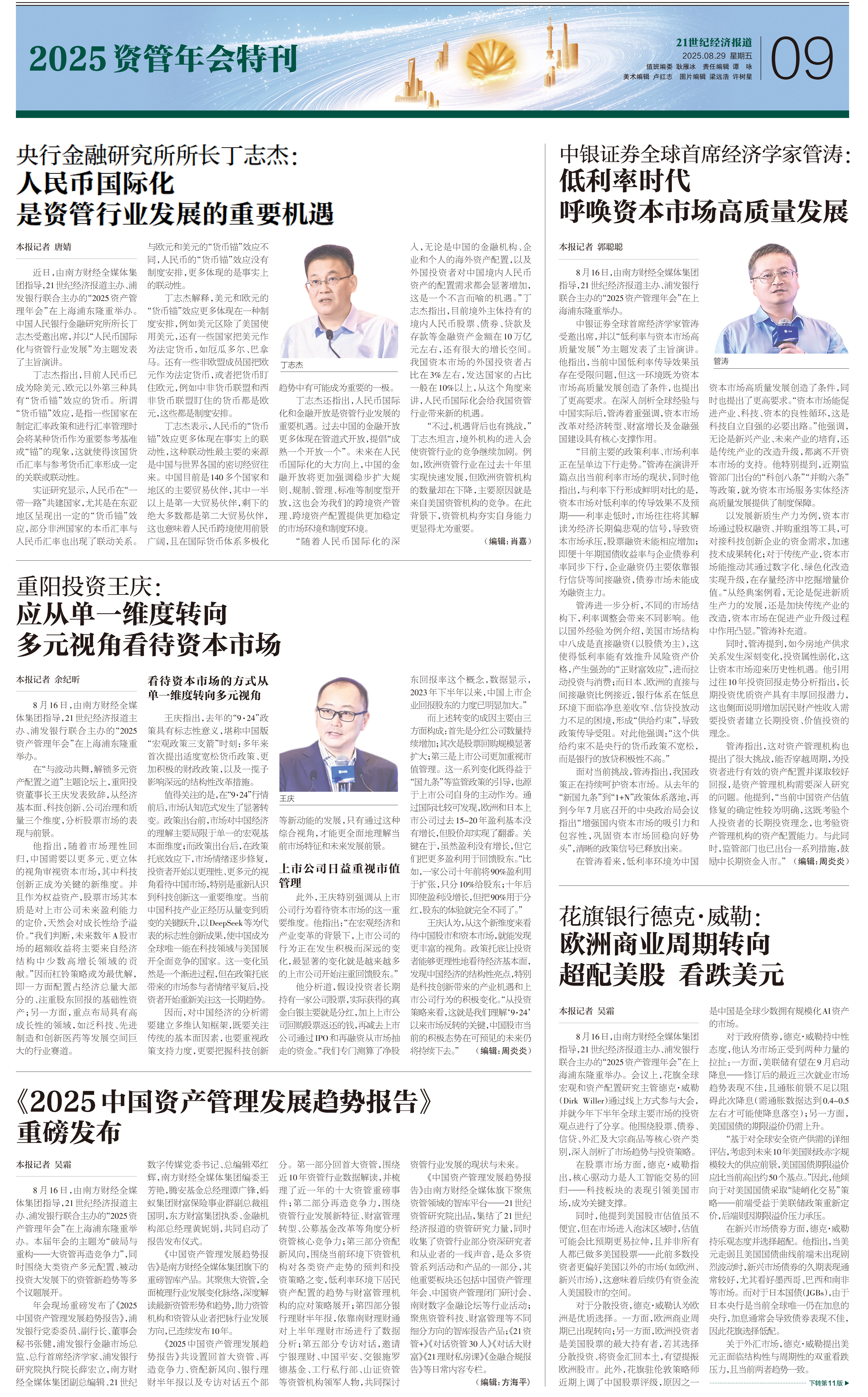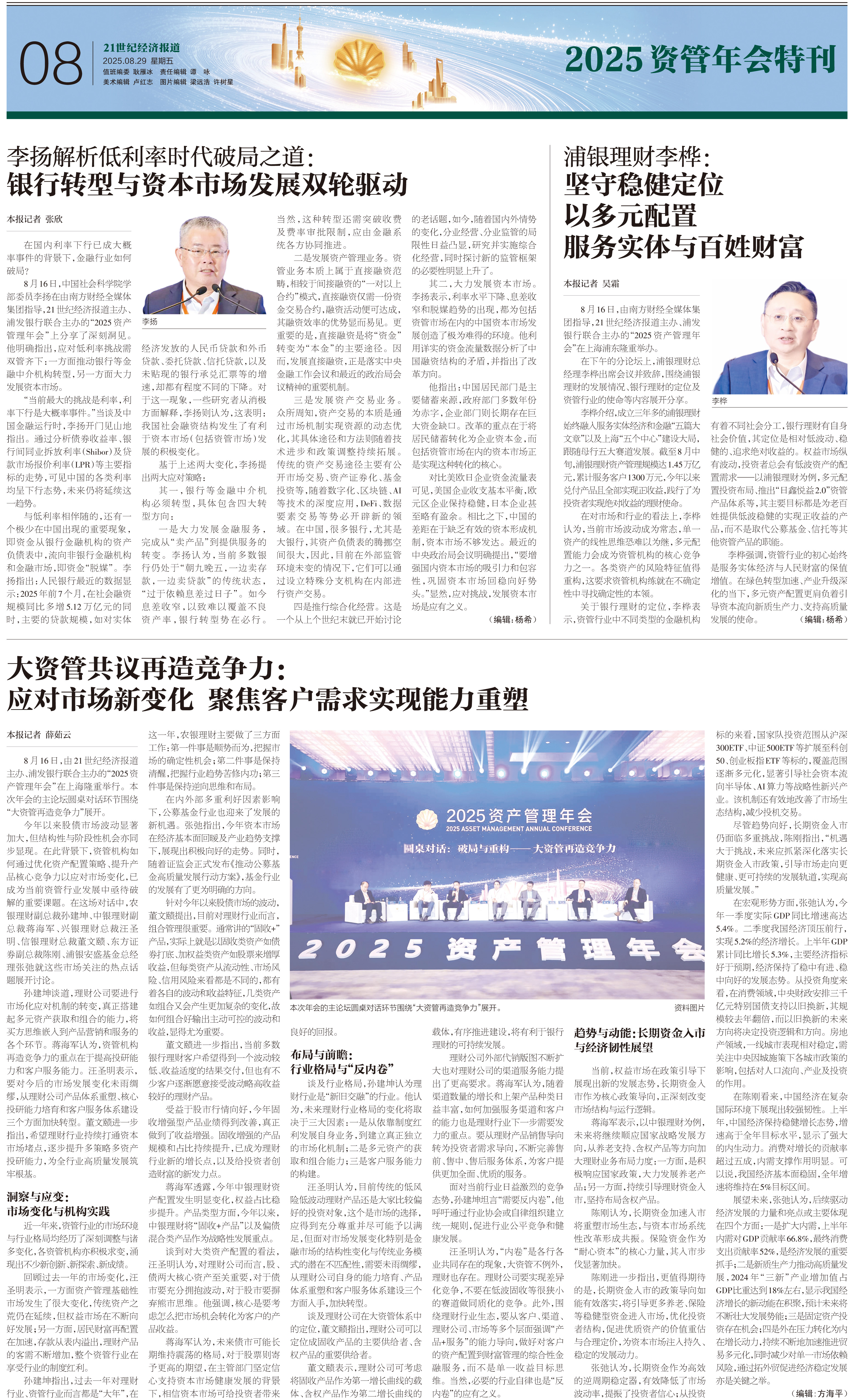 8月16日,“2025资产管理年会”在上海举办。“资产管理年会”始于2007年,历经十余年积淀,目前已是国内资管行业最具影响力的盛事之一。本届年会聚焦主题“破局与重构——大资管再造竞争力”,金融监管部门、权威专家学者、各大机构的负责人等千余名资管人士参加会议并围绕大资管发展趋势、多元资产配置等重要议题展开分享和讨论,本专题特刊精选了部分会议内容予以刊发。