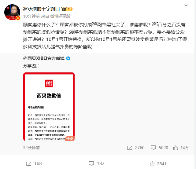 9月12日,贾国龙接受采访时表示“我现在陷入自证清白循环”。9月13日凌晨至中午1点,罗永浩连发7条微博,继续就此次风波发表言论。其博文称:如果让我给西贝支招,我能做的就是,建议它堂食不做预制菜,或堂食做预制菜的时候,标明是预制菜。