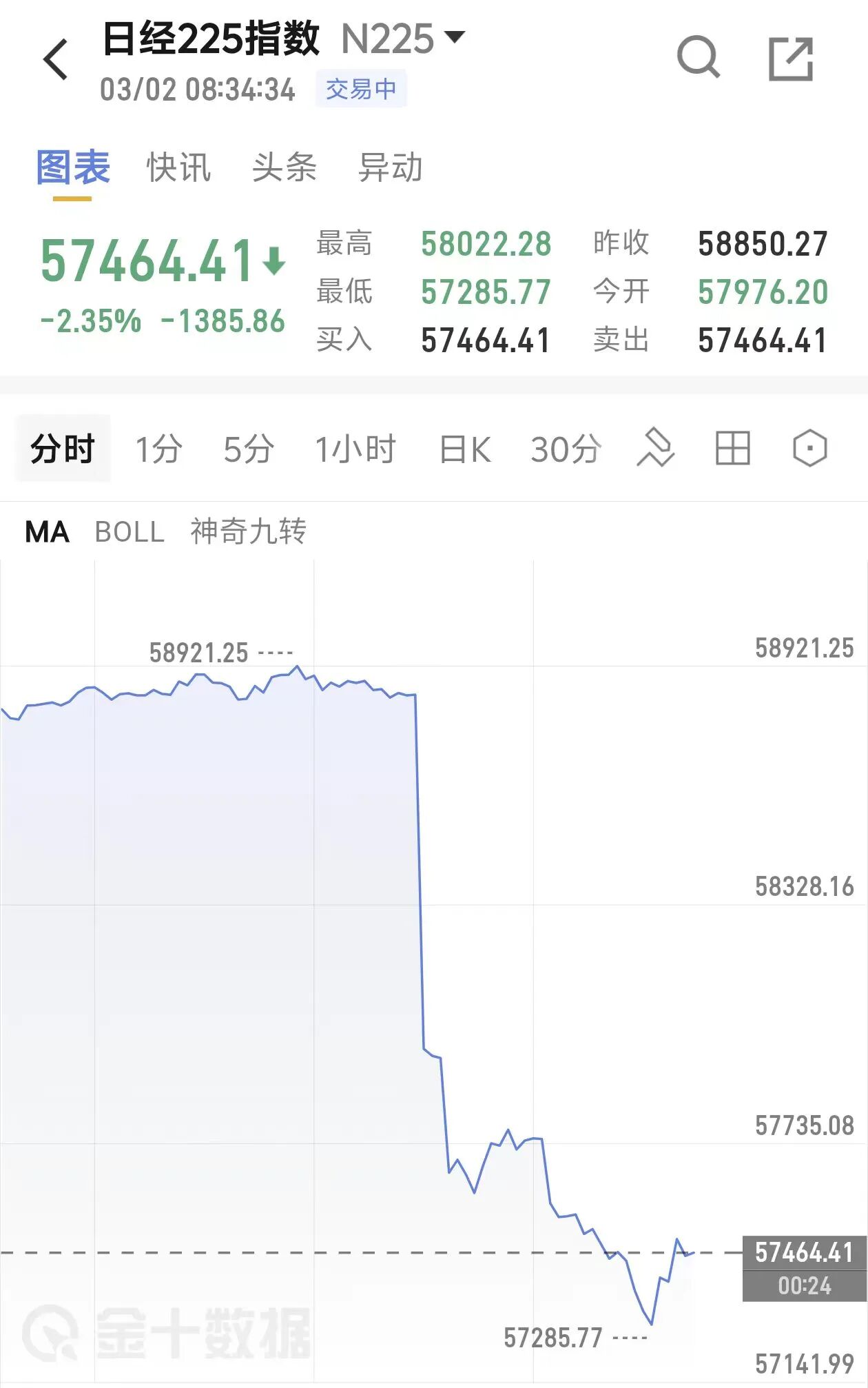 3月2日,日经225指数大幅低开,截至发稿,跌幅扩大至2.35%,下跌近1400点。权重股方面,本田汽车跌2.75%,索尼跌2.0%,日本烟草跌1.3%,武田制药跌1.1%;三菱重工涨2.65%。日本矿业指数涨幅扩大至9%。韩国股市因节假日休市。